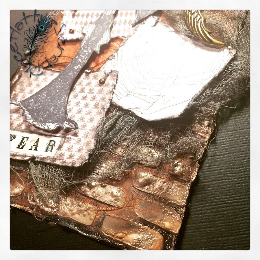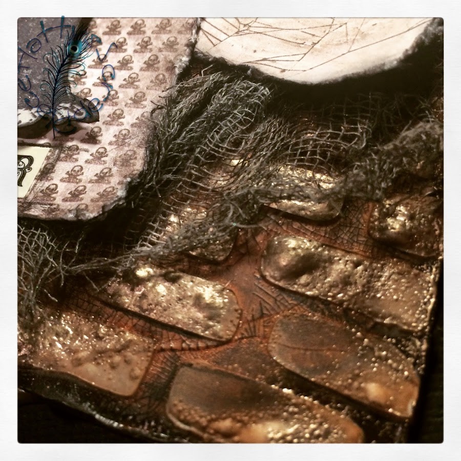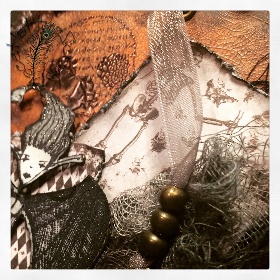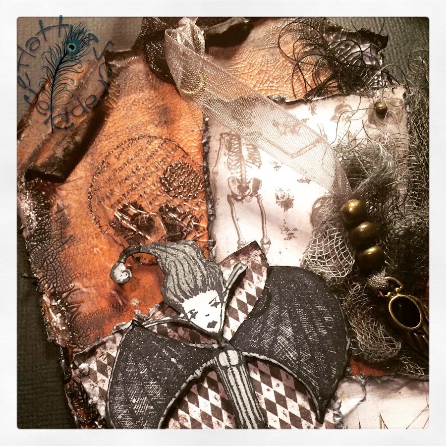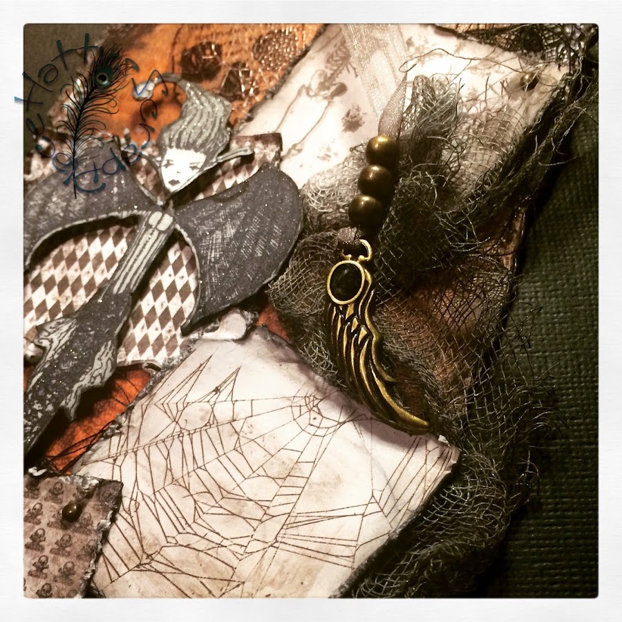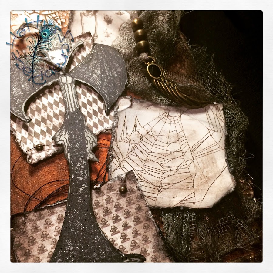Y debajo coloque trozos de hilos negro y una gasa; que previamente había guarreado con distintas tintas en spray, para darle un toque más siniestro.