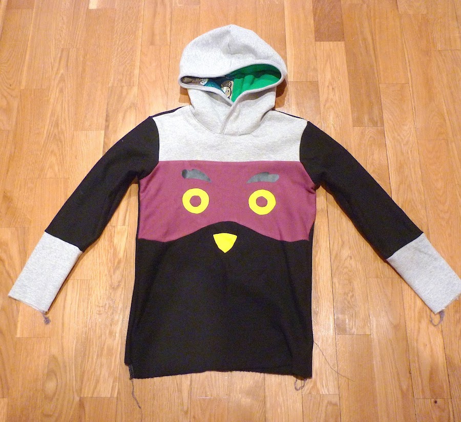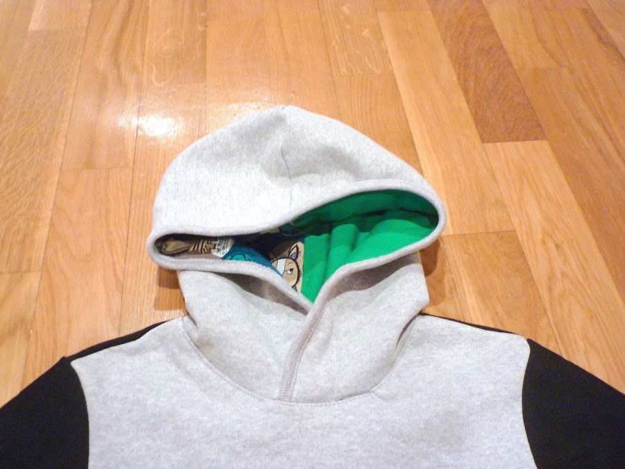 Además tengo que acortar las mangas y el bajo. Y creo que voy a cambiar la capucha. No voy a ponerle los snaps, así que puede que me cargue las piezas de entretela y puede que hasta el ribete. Dejaré sólo las telas interior y exterior para que las costuras queden mejor. Y haré el agujero para pasar la cabeza más grande, que le va justo.
