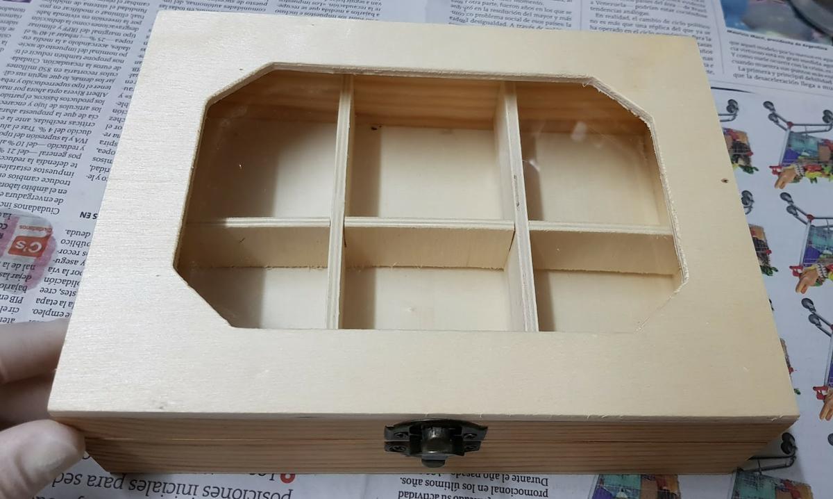 Una vez pegado, colocamos los separadores de madera dentro de la cajita, para que vaya haciendo presión en el pegamento.