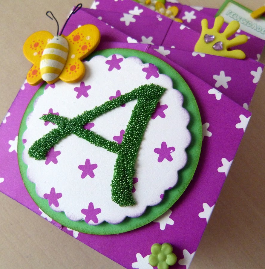 La letra está cortada con la Craft Robo y recubierta de bolitas bailongas de Martha Stewart. Está montada sobre Framelits de Sizzix con cinta 3D para darle volumen.