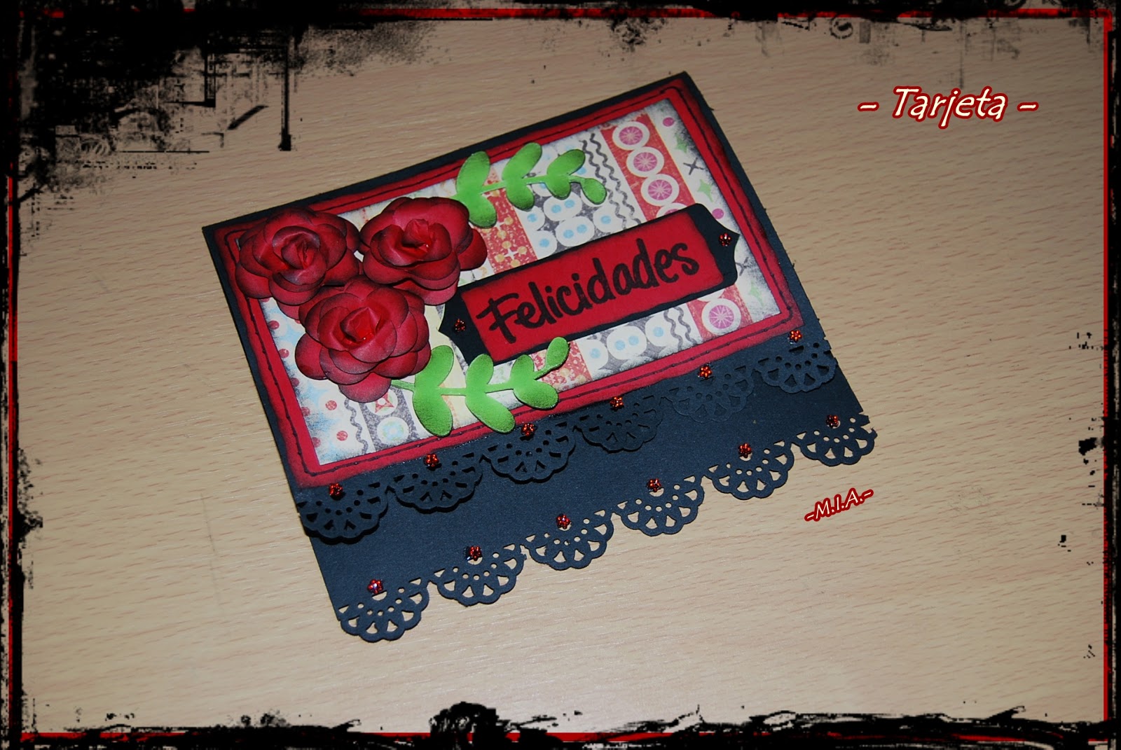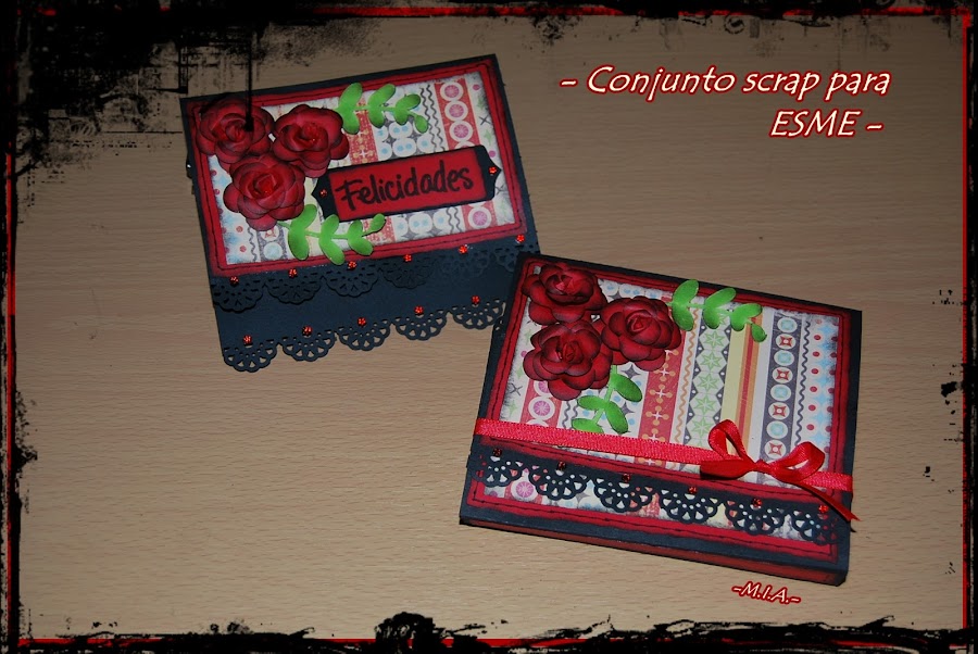 Los dos cosas han sido elaboradas con los mismos papeles y cartulinas. Los bordes estan hechos con la troqueladora de bordes EK Abstract Flower Edge. Sobre la carulina roja un falso cosido con rotulador negro. Adornan unas rosas caseras hechas por mí y entintadas con versafine negra. Dos hojitas verdes completan el bouquet, a las que di un toque de glossy acent para dar un poco de brillo y volumen.