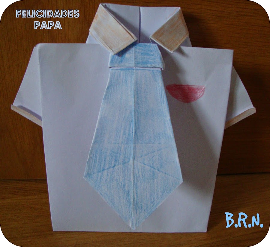 A partir de aquí, a rellenar las hojas en blanco con preciosas historias...Y para completar el regalo y demostrar a papá más habilidades en papiroflexia, siguiendo un vídeo de un canal que le gusta: PapiroCrazy, le preparó esta camisa recién planchada y con todo detalle.