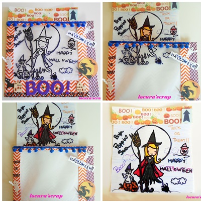 Como se ve en la imagen es una tarjeta mágica, en la que el dibujo aparece en blanco y negro y al tirar va saliendo en color , el dibujo que hicimos , para el que conozca el blog de las monstruitas Monsters Cake sabrá, que es la cara del diseño que hace sara para dibujarse así misma , nada mas que nosotros la disfrazamos para el truco trato :-))