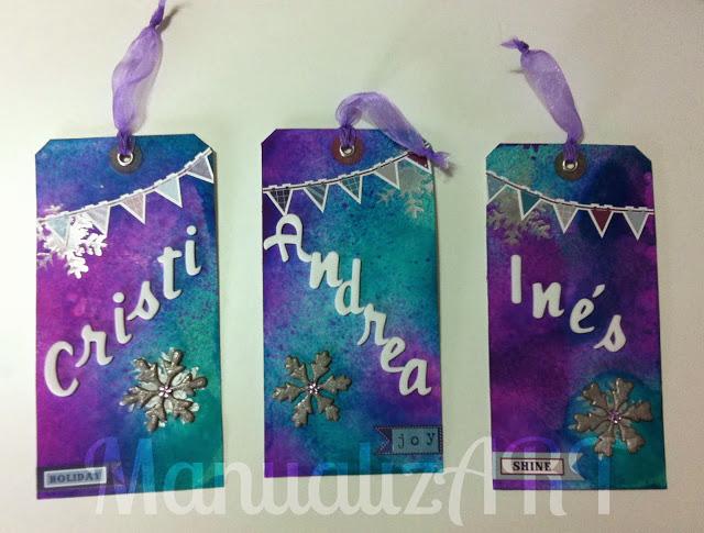 Pues desde que la hice para el reto de De scrap y otras cositas lindas tuve clarísimo quiénes iban a ser sus destinatarias. No obstante, quería que el factor sorpresa jugara su papel en este intercambio vecinal de felicitaciones, así que dentro del bolsillo interior de la tarjeta, incluí estos tags personalizados para que los colgaran en su árbol.