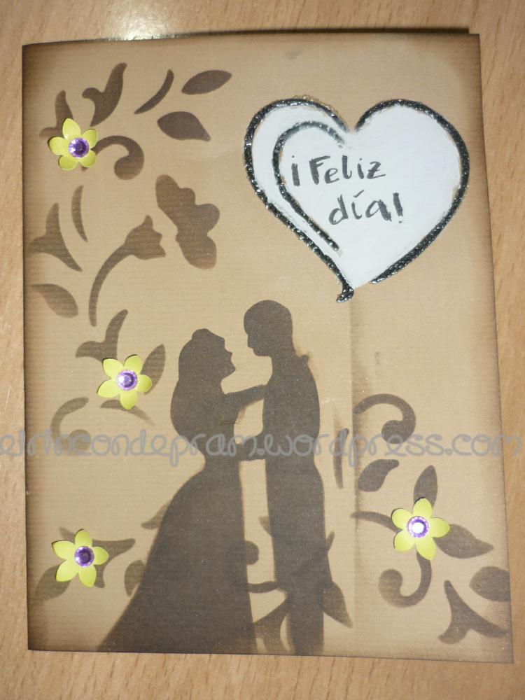 Para la felicitación de boda, estampé un corazón con la plantilla, le apliqué relieve y rellené el interior con pintura de tiza.