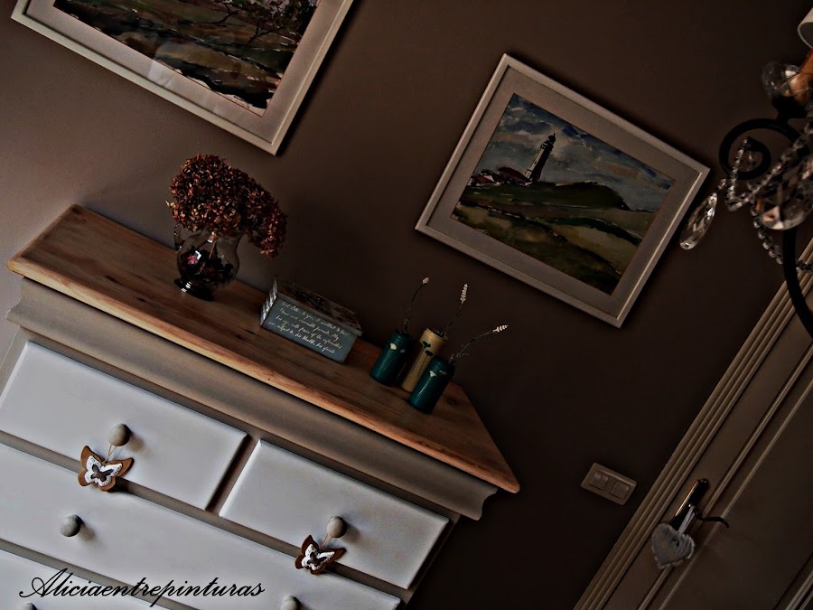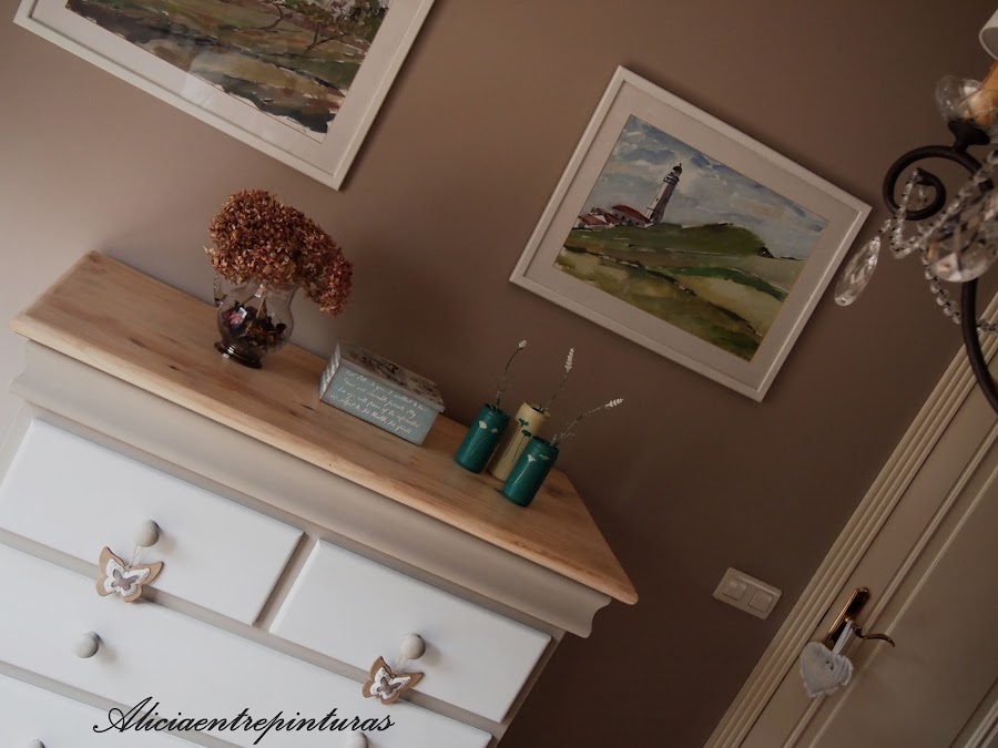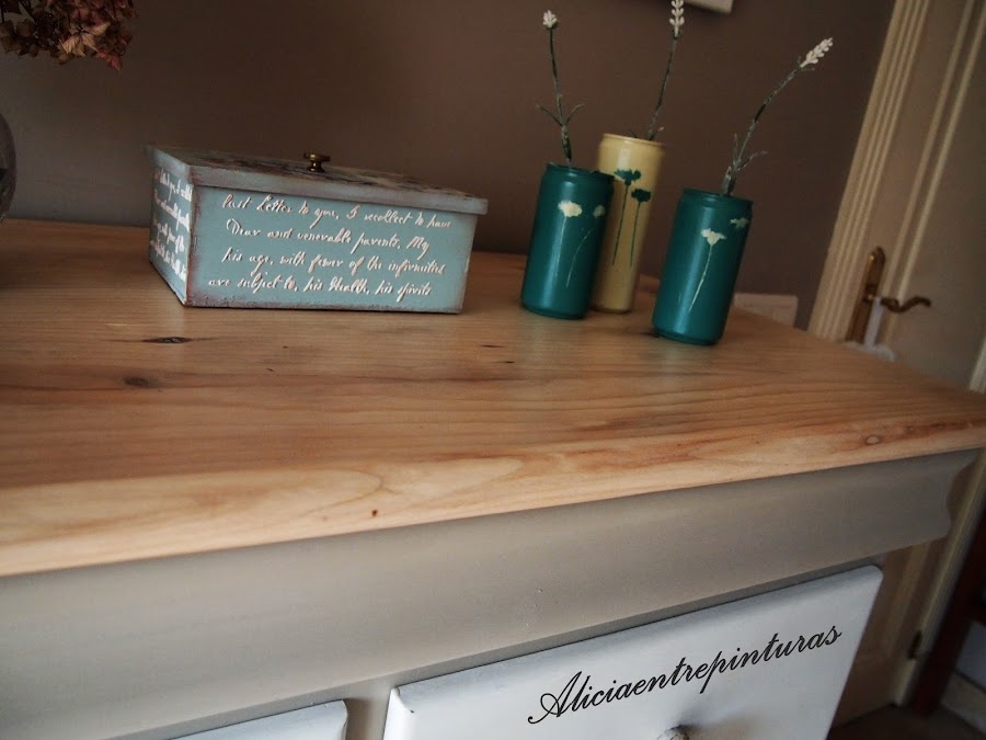 Está realizada con pinturas a la tiza blanco antiguo, y una mezcla de gris lino y ocre antiguo. Varias manos de cera, barniz y otra vez cera y a frotar.