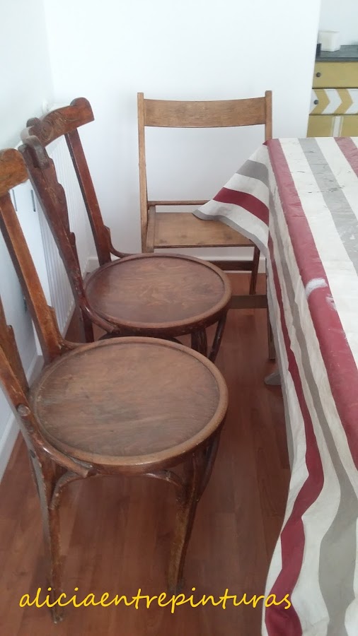 Estas sillas fueron un hallazgo de mi hijo. Pensaba venderlas pero le gustó el resultado y ahora están guardadas para su "ajuar".
