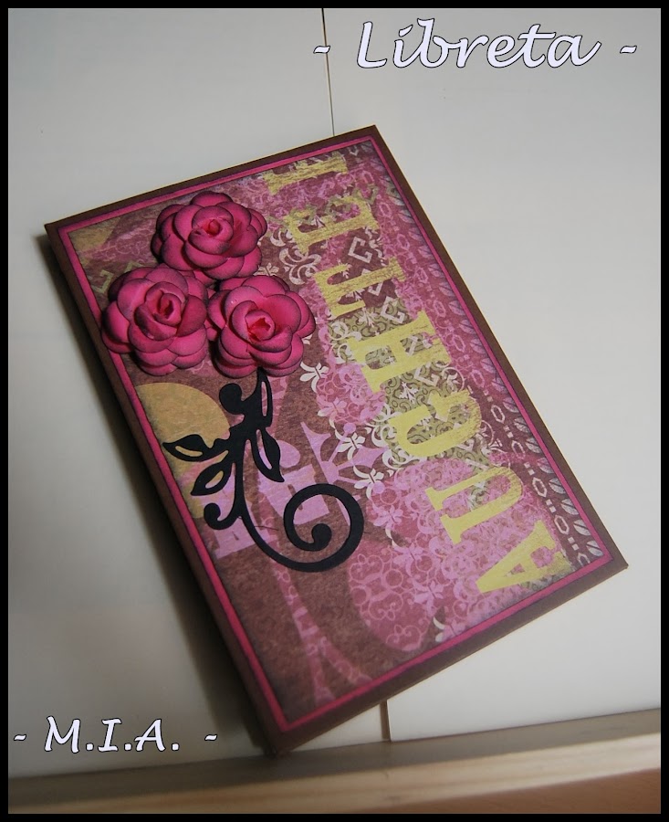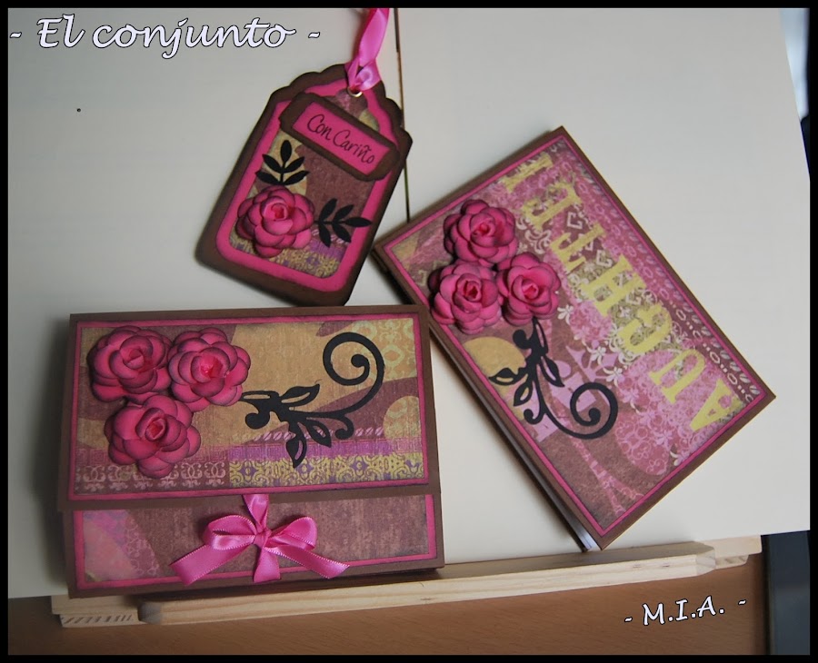 De nuevo combiné cartulina negra y fucsia con papel decorado en esos tonos y entintado todo con versafine negra. Como adornos usé unas rositas caseras con un troquel en cartulina negra y lazo de satén en tono rosa.