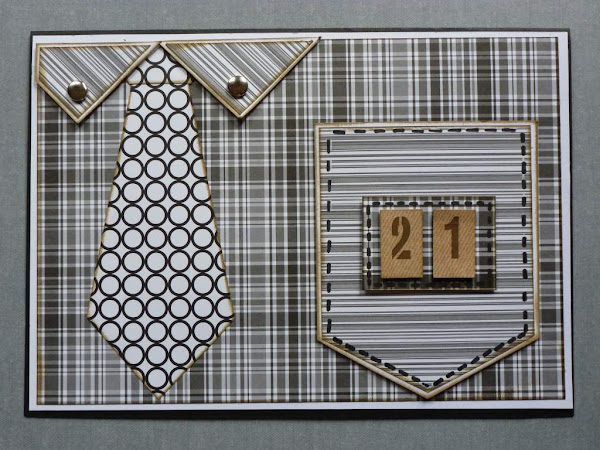 Para esta tarjeta que imita una camisa, he usado una cartulina básica negra como fondo. Y sobre cartulina básica blanca comencé el montaje. Es cuestión de ir recortando formas para el bolsillo, el cuello y la corbata. Estos elementos superpuestos están hechos en papeles diferentes, para que destaquen un poco más. Y como adorno, dos brads plateados que imitan los botones del cuello.