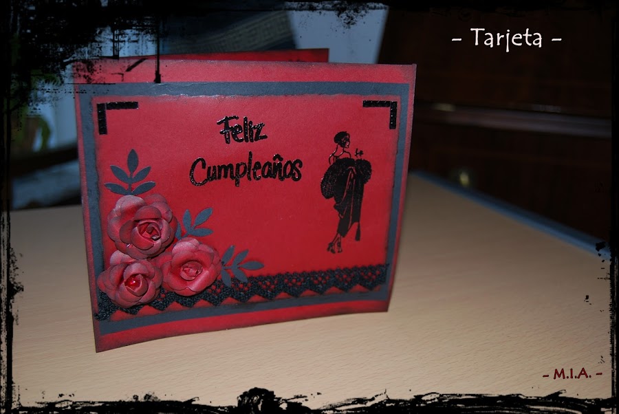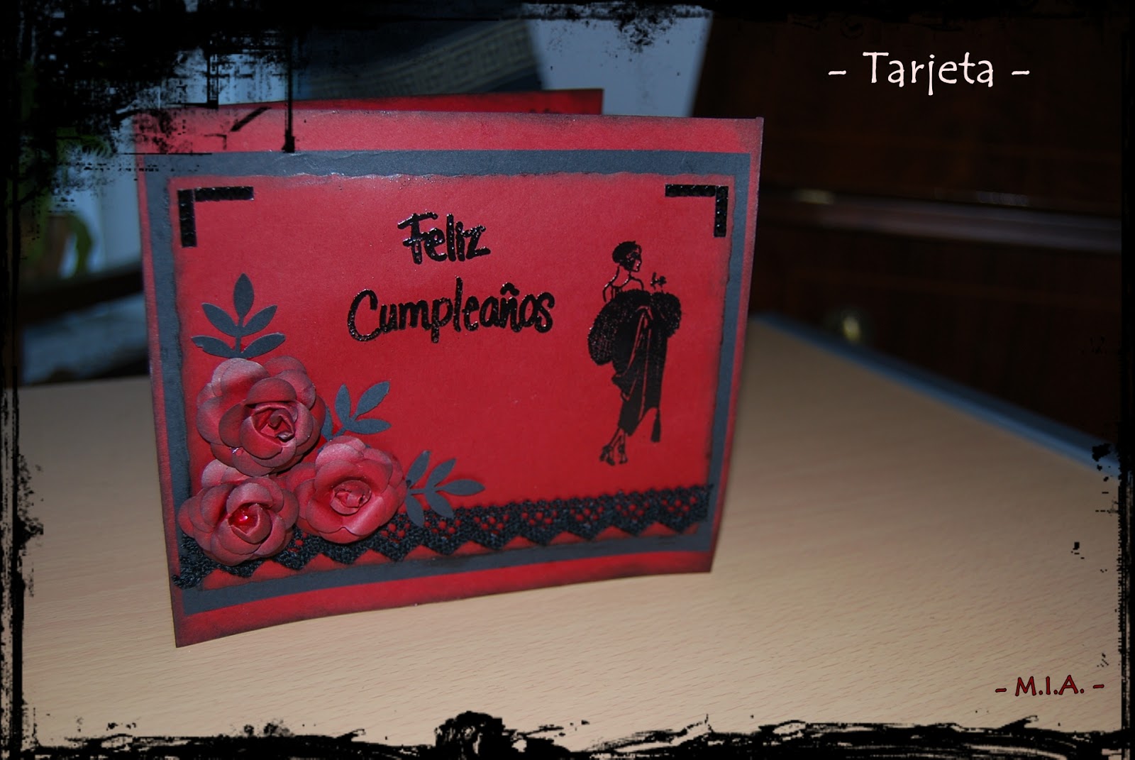 Como acompañamiento le confeccioné una tarjeta en la misma línea, embosando con polvos negros el sello Hampton Art Cling Vintage Ladies, el encaje y las perlitas en negro negro y de nuevo rosa casera. El letrero de "Feliz cumpleaños" es de Mensajes en Español de Stampendous que también va embosado con plovos negros.