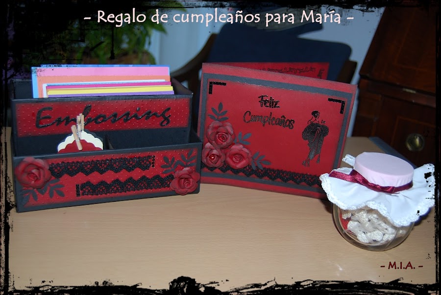 Una caja para guardar las cartulinas embosadas que nos van sobrando de los trabajos. Partiendo de una caja de cereales le di forma y la forré con cartulina negra. Delante, un poco mas pequeños le hice dos departamentoS para los tarritos de embosing, tags, sellos o lo que se quiera guardar. La otra cartulina para combinar la elegí en corinto, un color que me encanta trabajar y en contraste con el negro queda bastante bien. Estas cartulinas las embosé con la placa de textura de la Big Swiss Dots y recorté las letras con la craft varias veces para pegarlas y darle volumen y por último el glossy acent para dar brillo. Unas flores caseras para adornar, un encaje y unas perlitas azabache terminan el trabajo.