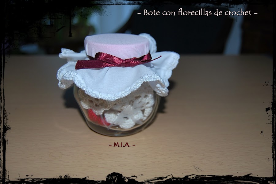 Y por último un pequeño tarro de cristal al que grabé su inicial y una espiga y lo llené de florecillas de crochet para que utilice en futuros trabajos.