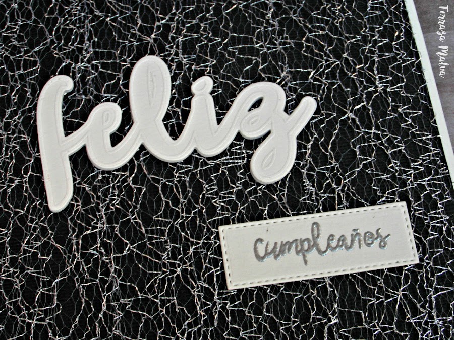 En esta tarjeta he empleado cinta decorativa que asemaja a una rejilla metálica. La palabra "feliz" está troquelada en gomaeva blanca en la que he embosado también en blanco los bordes de las letras. En el rótulo la palabra "cumpleaños" también va embosada, pero esta vez con polvos plateados combinando la rejilla.