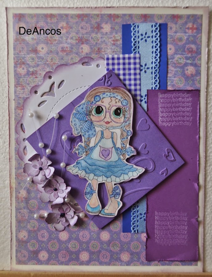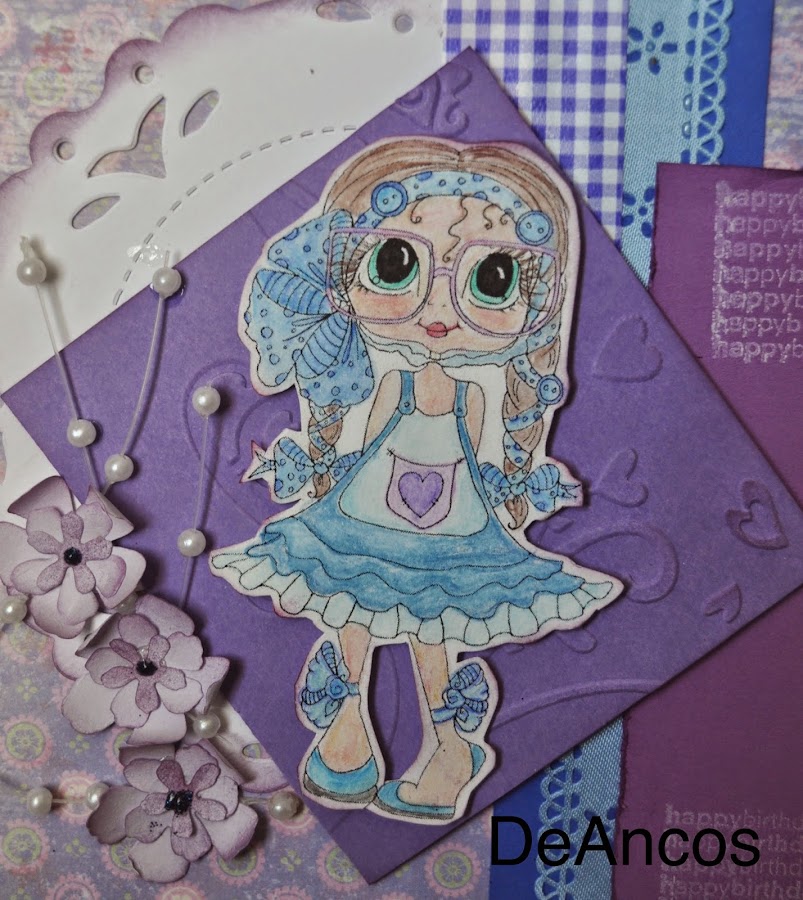 He pintado la muñequita MyBestie con lápices acuarelables en tonos azules, que me gustan mucho, rodeándola de elementos lilas y morados. Me encanta esta combinación.