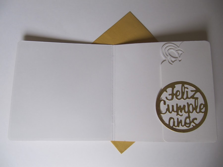 Todo enmarcado con un papel dorado, el cual utilice en el interior de la tarjeta con un troquel bonito de "feliz cumpleaños"
