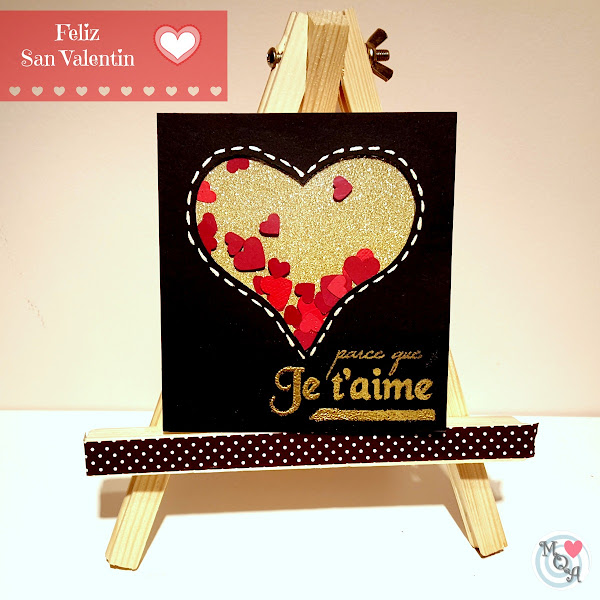 El sentiment que utilicé, creo que es el único que tengo relacionado con el amor "Parce que Je t´aime" (Porque yo te amo) está hecho con embossing dorado. Y para agregarle un pequeño detalle adicional, el cosido alrededor del corazón, está realizado a pulso con pintura acrílica dorada, pues el rotulador dorado, se lo chupa la cartulina negra.