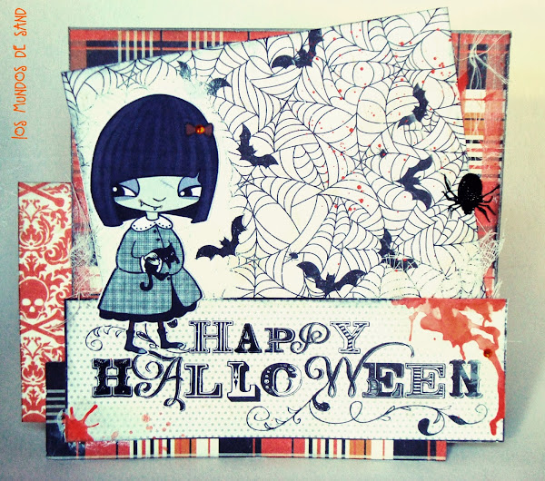 En este caso elegí esta terrorífica niña con su gato (no puede faltar) para desear a una amiga un feliz Halloween. Para ello he empleado los papeles de Authentique, Thrilling collection, creando una composición desesctructurada y aplicando gesso, tintas y algún que otro guarreteo.