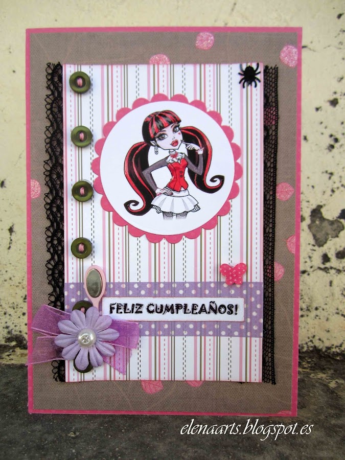 Para el 8 cumpleaños de la hija de Cristina- mi compañera de trabajo, y conociendo los gustos de la niña, salió esta tarjeta de felicitación :) Las Monster High te desean un feliz Cumpleaños, Alexia!!!