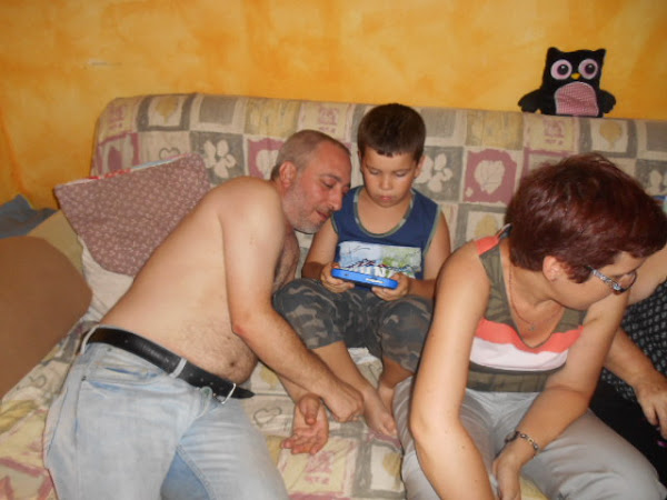 Los peques le hicieron unos dibus superchulos, me despisté y no le hice la foto, a ver si las consigo, en la esquina se ve el dibu de Ari, un elefantito con un conejito columpiándose en su trompita y el de Unai era uno muy chuli de Super Mario Bros