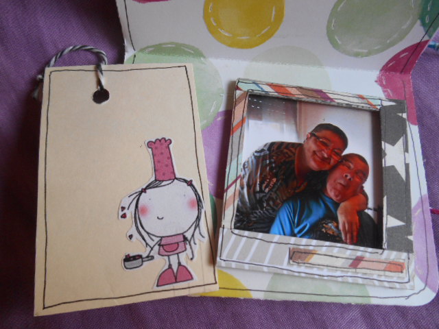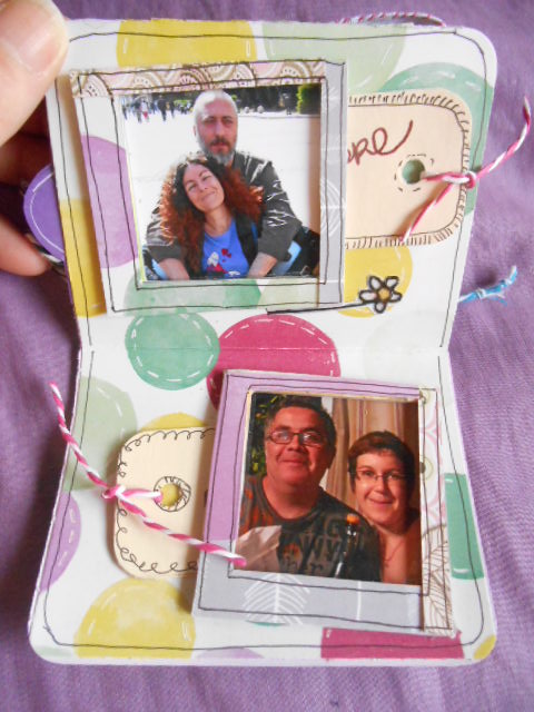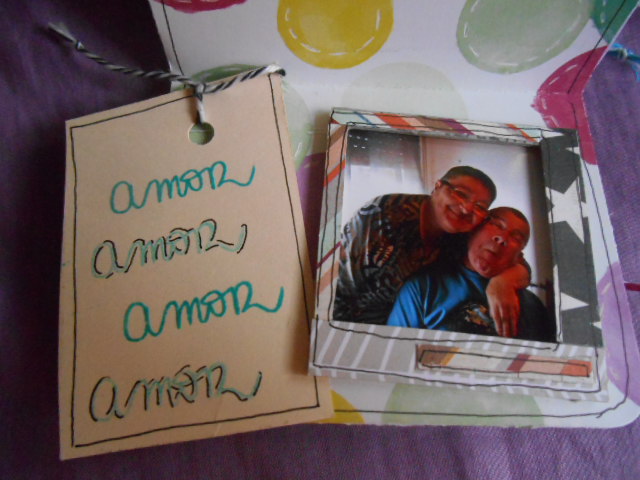 tipo foto polaroid, los marquitos como siempre reciclados del Carcassone, decorados con retalitos de papel y riveteados con boli negro