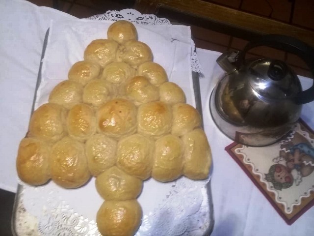 Y para variar, en lugar de pan de jamón este año hice un arbolito de pancitos rellenos con queso crema, queso mozzarella y tocineta. Muy buenos