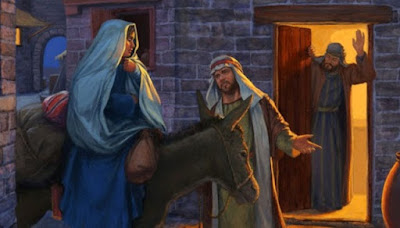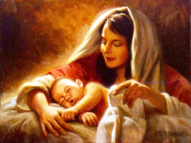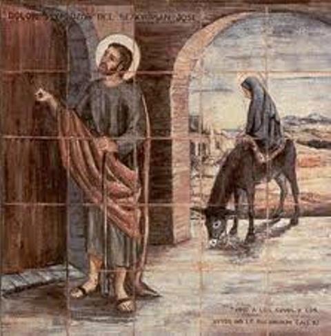 "... y tuvieron que alojarse en una gruta que servía de refugio para los animales. Estando allí, se cumplieron los días de su parto, naciendo el niño durante la noche. Después de dar a luz a su hijo, María le envolvió en pañales y le acostó en un pesebre... "