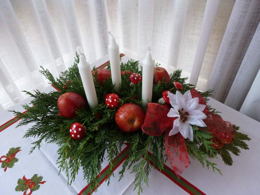 El verde lo pone la tuya, muy cómoda de trabajar y que cubre el mossi perfectamente. Las manzanas rojas me gustaron tanto cuando las ví en la frutería, con un tamaño tan adecuado, que compré un montón. Y como sólo he puesto cuatro, el resto irá a una macedonia de frutas, jaja. He puesto también unas bayas rojas que recogió mi marido de un arbusto. Y para terminar de adornar, unas setas preciosas que tengo hace muchos años, un lazo rojo y una flor de Pascua blanca que da luz al conjunto.