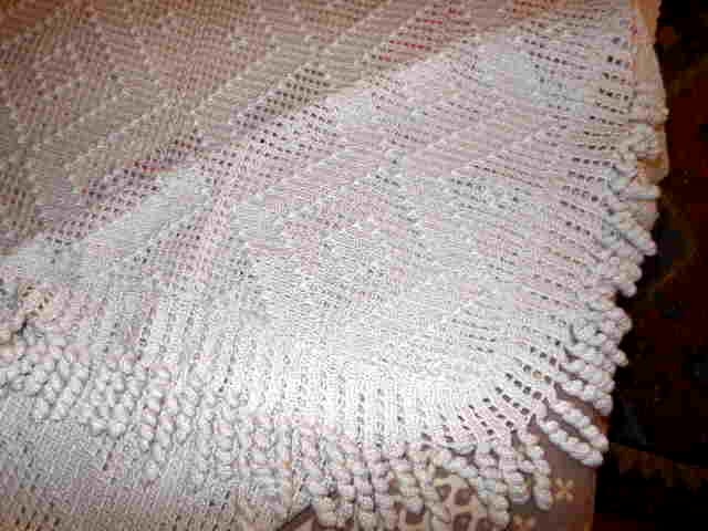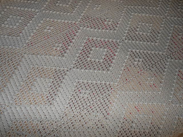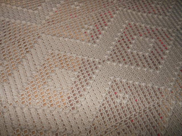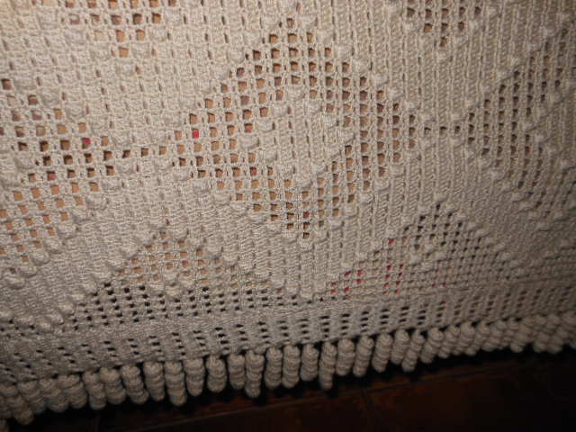 Esta hecha a tiras, que luego se van uniendo, el hilo no es el más fino, pues para una casa de campo, me pareció más rústico y en color marfil que también le da el "punto" (eso me parece a mí)