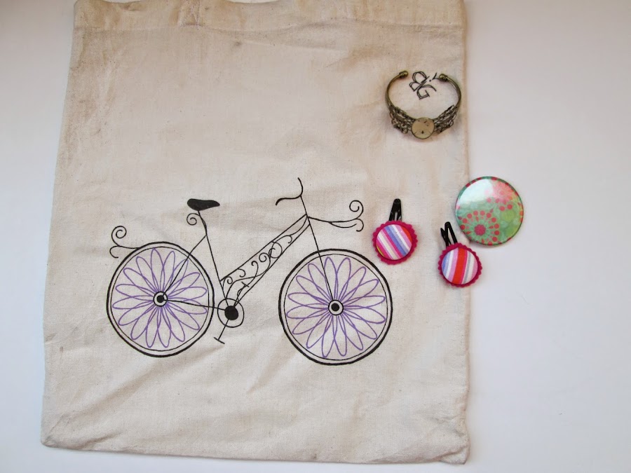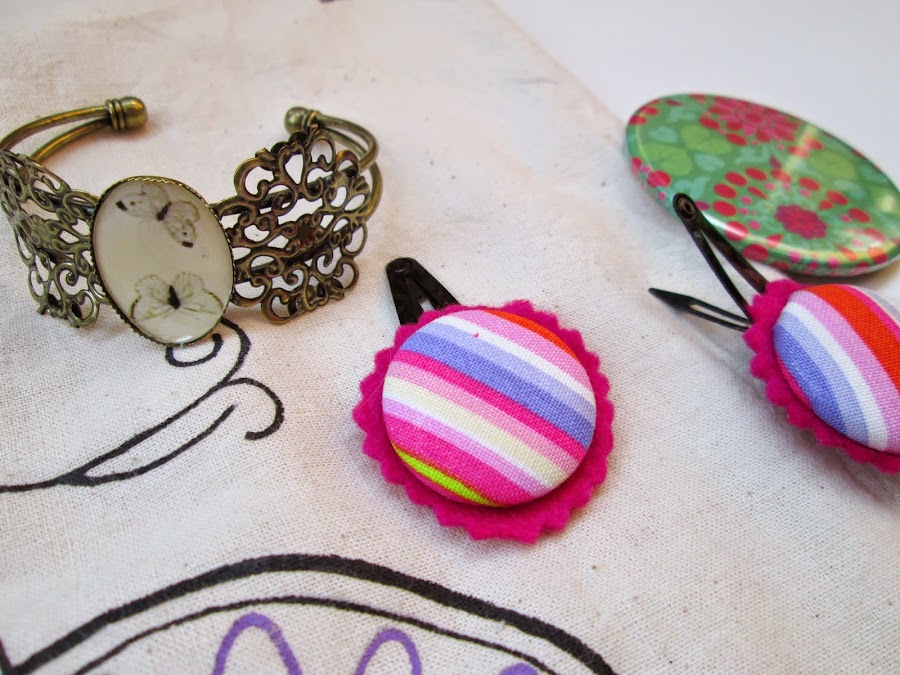 Una Totebag pintada a mano, unas horquillas de botones forrados, una pulsera y un espejito!!