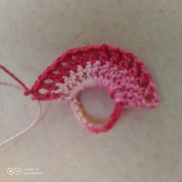 Terminamos el paso con 8 cadenas y punto raso sobre la última vareta del abanico.
