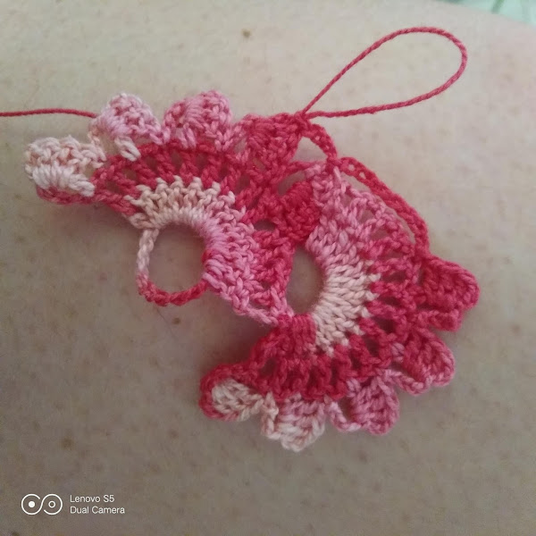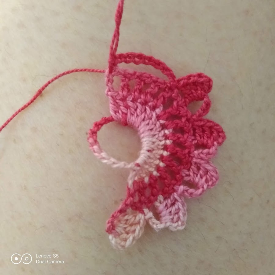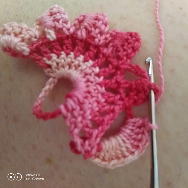 PASO 7: Realizamos los 5 pétalos como en el paso 4. 8 cadenas, punto raso en la última vareta del abanico. 3 cadenas (que son la primera vareta del siguiente abanico) punto raso en la tercera vareta del segundo pétalo de la flor anterior y giramos.