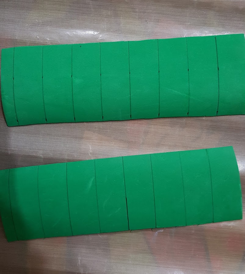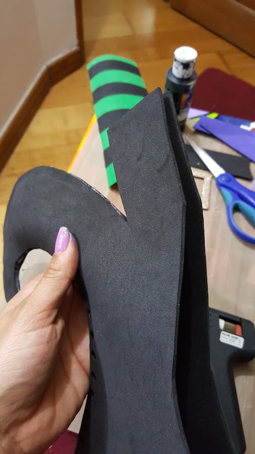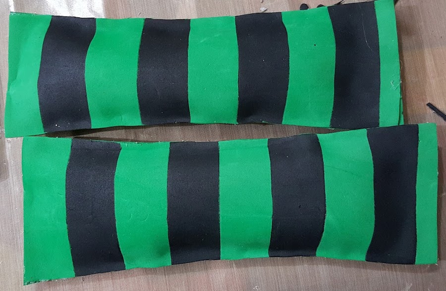 Se hacen las medias cortando rectángulos que simularan las medias, las cuales las pinté con acrílico negro para darle las rayas características de las medias de brujas