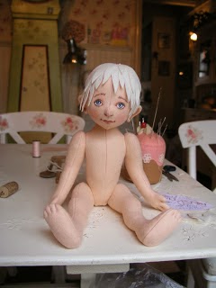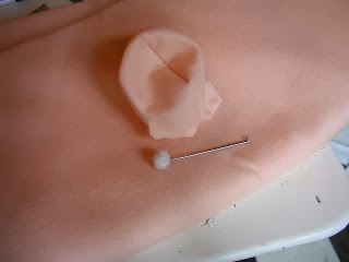 Separamos la cabeza del cuerpo dando unas puntadas y estirándolas,hacer esto dos veces para reforzar.Aunque en esta muñeca no se ve,pero soy partidaria de terminar una parte para empezar otra,por ello terminaremos los detalles de la cabeza : Le cosemos las orejitas. Damos unas puntadas para hacer el hueco de ambos ojos,(si se les quiere hacer párpados y poner pestañas hay un tutorial para poder hacerlo en toda clase de muñecos).La naríz se hace,haciendo primero un ligero bosquejo en la tela y cogiendo unas puntadas en cada lado de las alas de la naríz. Para hacer el triángulo de la naríz a la boca,se cose desde la fosa nasal hasta donde termina la comisura de la boca,tanto en un lado como en el otro se cose al cuerpo.