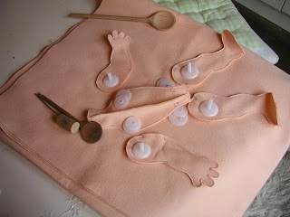 Cortar y coser las partes del revés, aquí se les ve con las juntas de plástico para los brazos y las piernas. Dar la vuelta,rellenarlos y poner las articulaciones en su sítio.