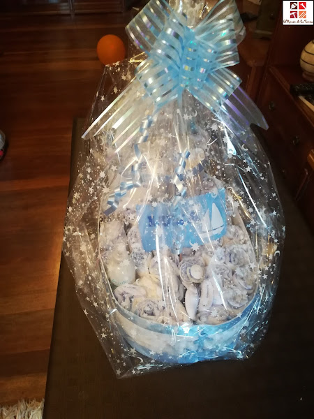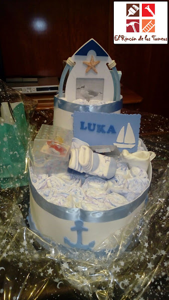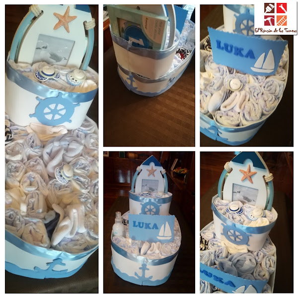 Lo siguiente fue hacer la parte de arriba de igual manera que la parte de abajo pero más pequeña, y con la goma eva, más decoración marinera y por último lo más divertido, fuimos metiendo los pañales, intercalados con los regalos, bodys, chupetes etc.