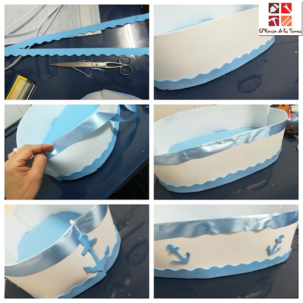 Seguimos trabajando con la goma eva, las olas , anclas por los laterales del barco y rematamos y decoramos con cinta pegada con la pistola de silicona caliente.