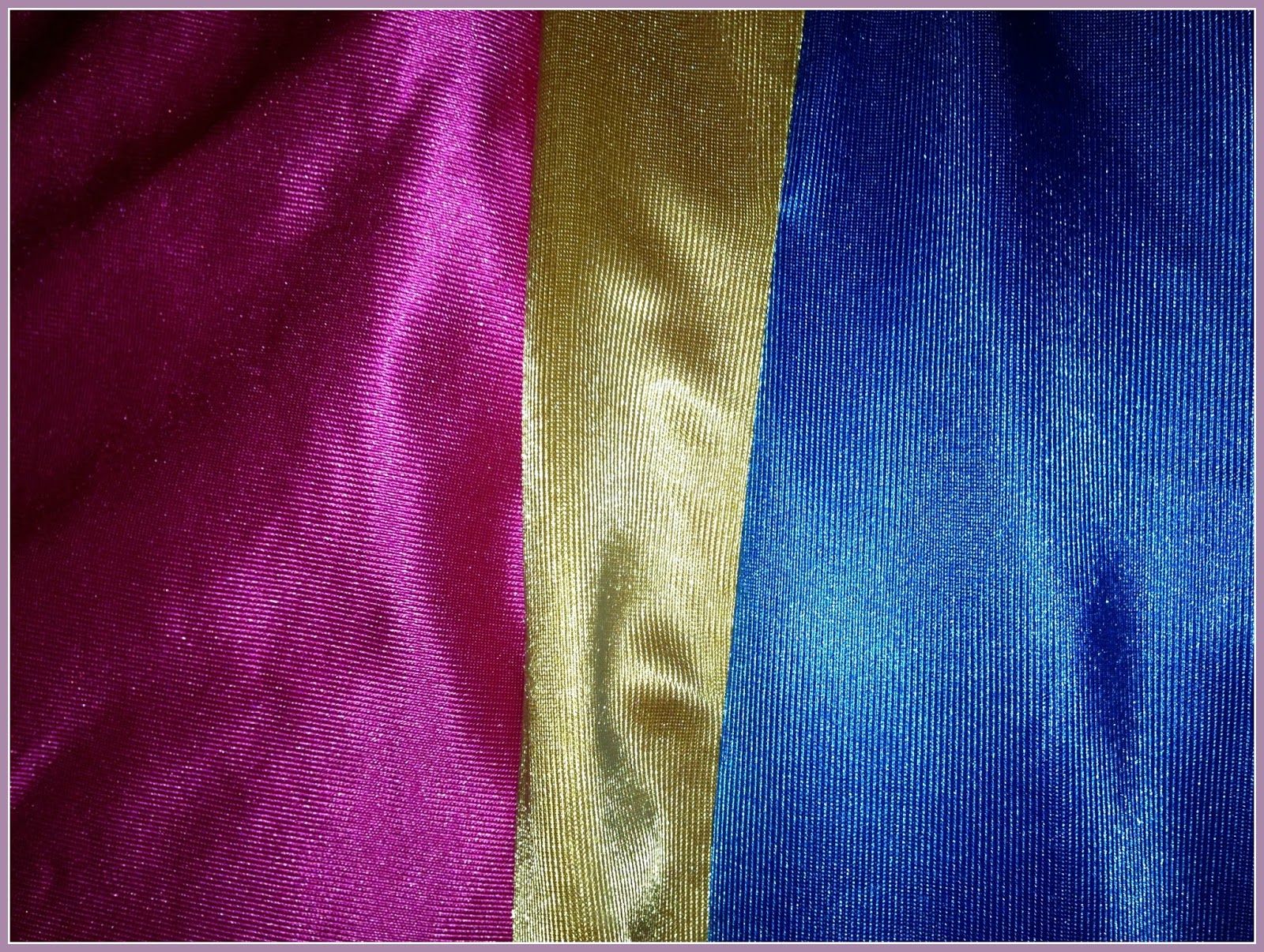 A mi hija le he hecho su sari con 75 cm de ancho y los dos metros de largo (cuanto más largo es el sari más pliegues podemos hacer en la cintura y más bonito queda). En el borde inferior he cosido 5 cm de rasete dorado, e igualmente le he puesto dos franjas doradas al final. A todo lo largo del sari he cosido una tira de pasamanería dorada comprada en los chinos. Aquí os pongo las telas para que veáis el efecto del contraste.