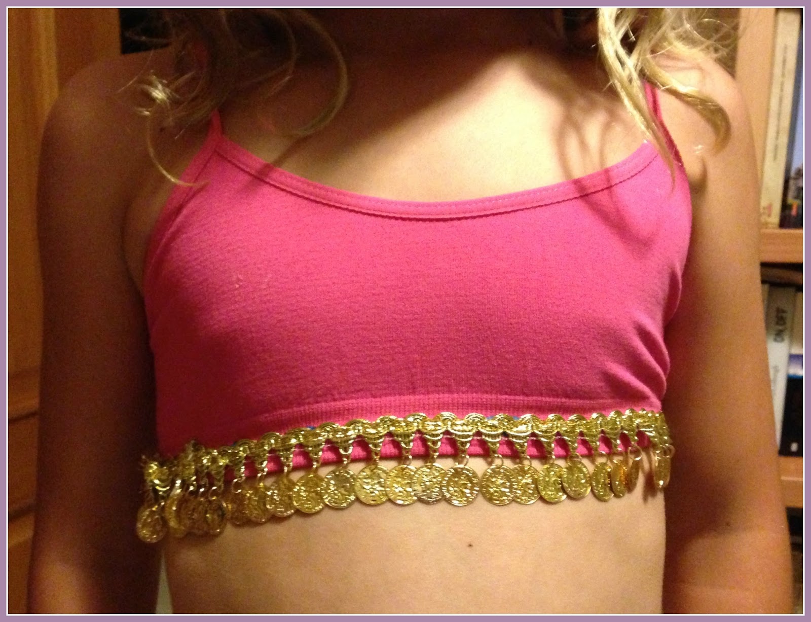 Después he comprado a mi hija un top de los chinos (para lo que me iba a durar hasta Primark era caro) y le he cosido una tira de pasamanería con monedas. Lo he cosido con la máquina de coser, pero estirando mucho el top hasta el máximo de su elasticidad, para que al ponérselo no le quedar tirante (la tira de monedas no es elástica).