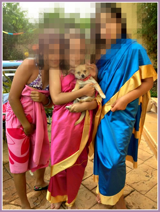 Lo primero, una vez escogido el tema de la fiesta, es elegir el disfraz. Evidentemente, como es una Fiesta Bollywood, las chicas van con Sari. Eso es perfecto, porque ¿cuantas oportunidades tendremos para ponernos un Sari? ¿y a que chica no le gustan? Cuando era pequeña nos los fabricábamos con las toallas de la playa, y el de este año no es mucho más complicado. Una vez vistas las opciones (al mirar por Internet casi cambio la temática a Fiesta Nudista cuando vi el precio de los Saris) decidí hacer uno. El Sari en sí es una pieza rectangular que se enrolla y pliega en la cintura (existen infinidad de vídeos explicando como ponérselo), así que no se necesita gran experiencia en la costura. El nuestro (he hecho uno para mi hija y otro para mí) está hecho con una tela que se llama rasete que he comprado a 1,80 euros el metro (ancho 150 cm) en este enlace. La tela es una maravilla, con un color precioso y no se deshilacha, con lo cual requiere poquísimo trabajo. En mi caso he comprado 2 metros rosa, dos azulones y un metro dorado.