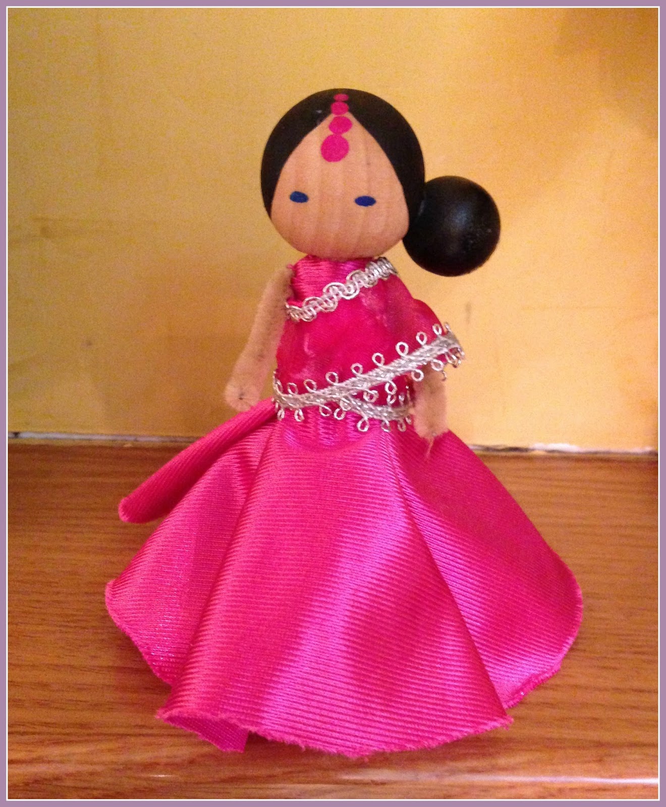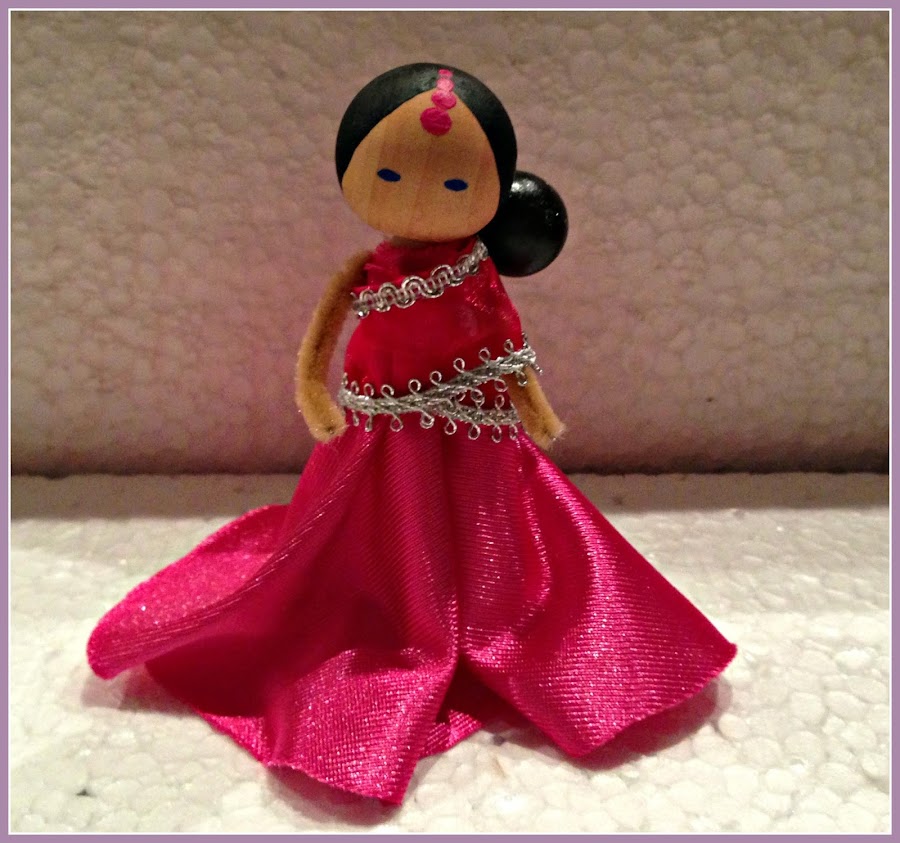 Por último ponemos un pedacito de lazo a modo de sari. Yo no encontré ningún lazo que me gustara, así que con un lazo de organza rosa y pasamanería de los chinos (¿no creeriais que no iban a salir en esta manualidad,verdad?) fabrique mis saris.