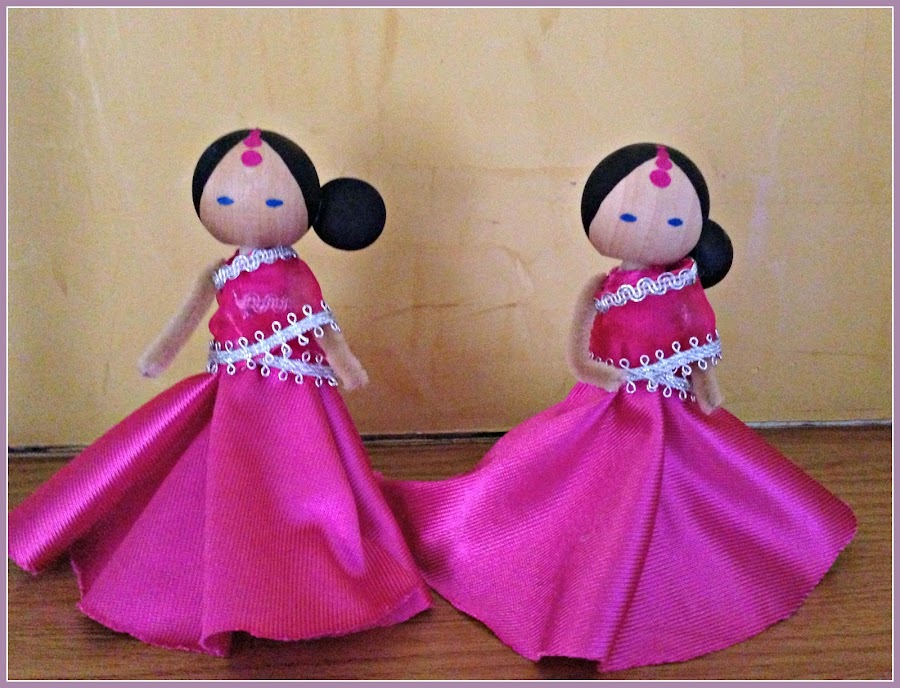 En realidad, una vez se tienen los materiales, son muy fáciles de hacer. Son pinzas de madera sobre una base de madera, una bola de madera para la cabeza y otra para el pelo, limpiapipas para los brazos, un trozo de tela para vestido y un pedacito de cinta para el sari.