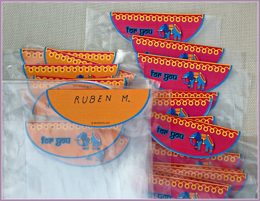 Para las chuches de las piñatas repartí entre los niños unas bolsas con su nombre (para intentar reducir las guerras al mínimo). Como podéis ver, son bolsas de plástico con etiquetas pegadas de tema Bollywood (como os comenté descargué todo el lote de este enlace).