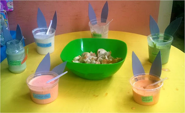Y para finalizar, entre mi amado esposo y yo realizamos varias salsas para los invitados, que fueron la sensación de la fiesta (junto al inflable claro! jejejeje).. Hicimos varios potecitos con orejitas de conejito en gris y les pusimos sus identificativos: Queso Cheddar, Piña (ananás), Pimentón, Ajoporro con Tocineta, Cilantro, Berenjena y Cebolla dulce.. Les juro que estaban una mas rica que la otra!! :P en verdad exquisitas!!!