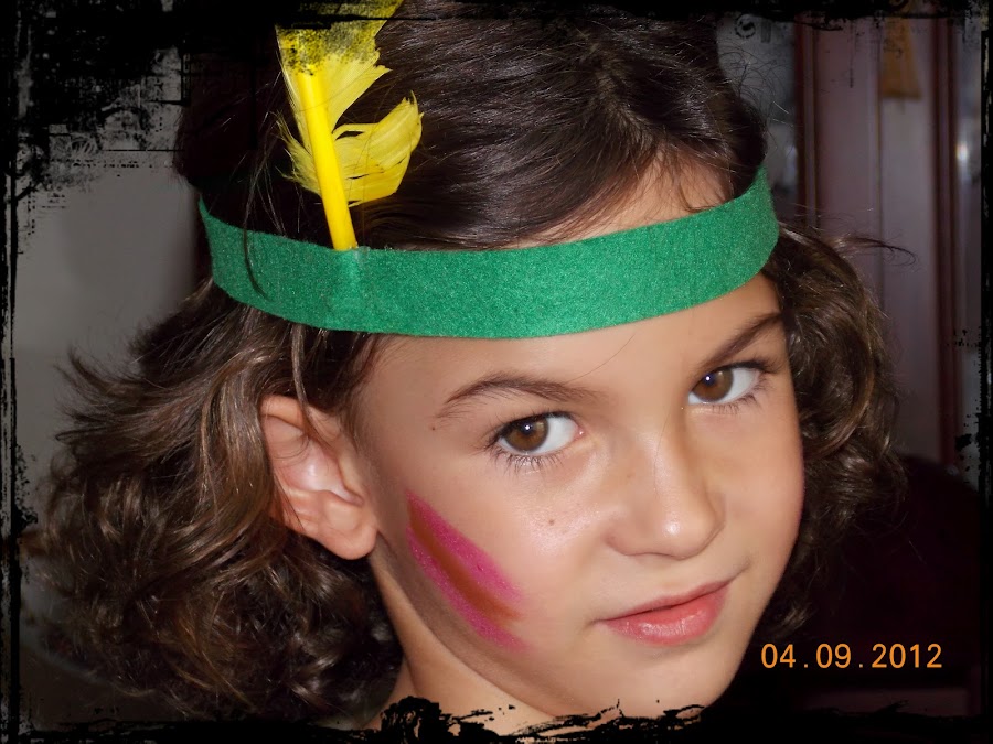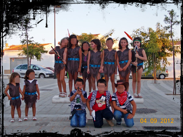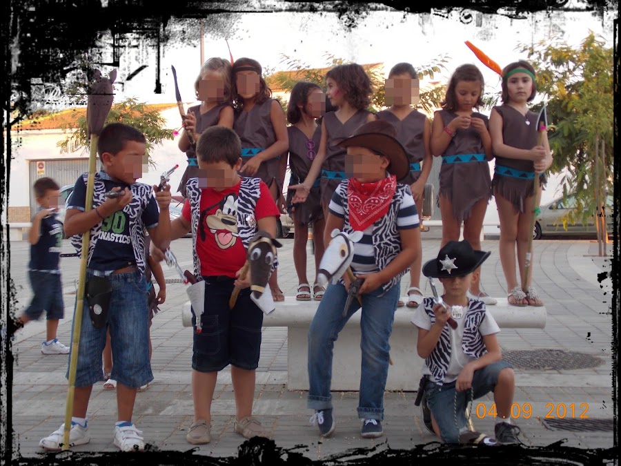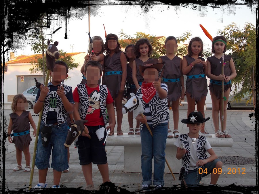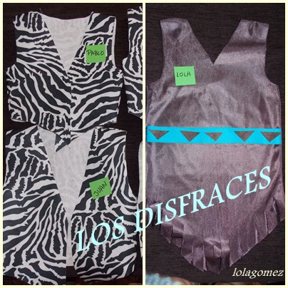 Ahora tocaba el momento ¿que nos ponemos? Pues nada para que todos fueran iguales, y no se quedase nadie sin disfraz mi máquina de coser y la gran ayuda de la Abuela Loli y la Tita Isa, hicimos un disfraz para cada niño. Para ellos chalecos de vaqueros de fieltro de cebra, y para ellas casuca india con su pluma y cinturón.