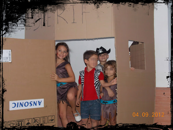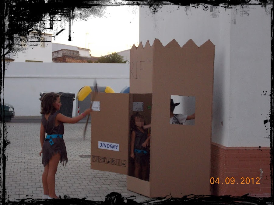 Para los vaqueros con una caja de cartón le hicimos la casa del sheriff. Y mira que hay juguetes sofisticados pero no hay nada como una caja de cartón y unos simples trapos para tener la diversión garantizada.