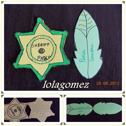 En esta ocasión ellos han elegido el motivo de las invitaciones, Pablo una estrella de sheriff y Lola una pluma india. Pintamos sus contornos sobre cartulinas y ellos (con ayuda de amigos y primos, la verdad) colorearon sus invitaciones y las personalizaron. Probablemente no sean las más estilosas pero no me negareis que son auténticas y encima DIY (que cuqui queda esta palabreja para decir que lo ha hecho uno mismo)