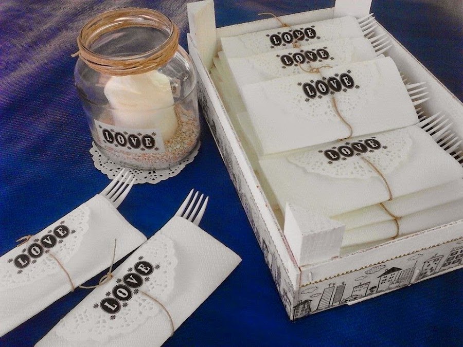 Como veis es un bote de crema de cacao al que le pegué cinta decorativa, le enrollé cuerda, puse piedras aromáticas y la vela en el centro. El cubertero es una caja de fruta pintada que hice hace unos años y los cubiertos son servilletas dobladas, con blonda plegada, cinta decorativa y cordel de nuevo.