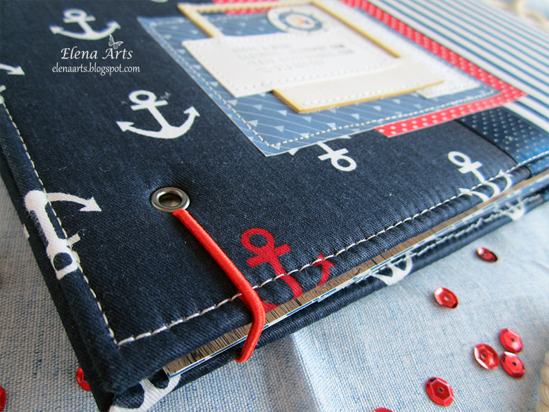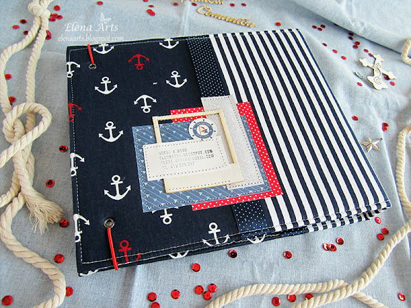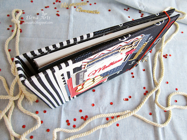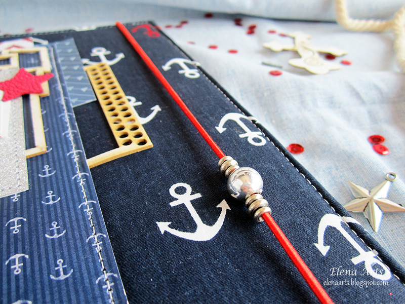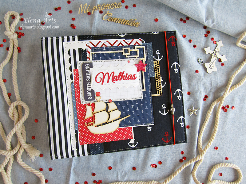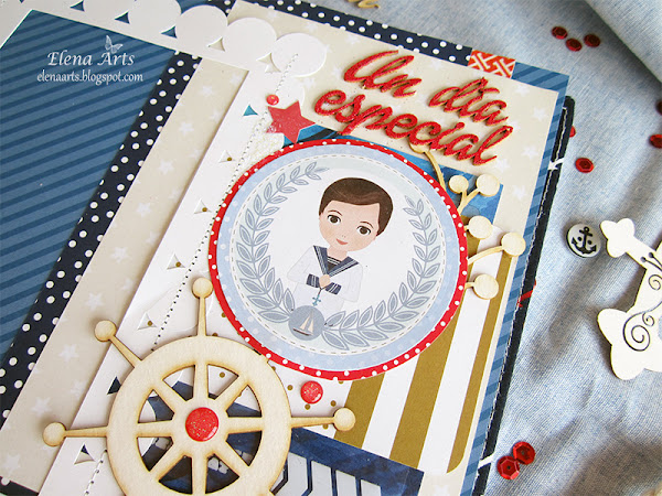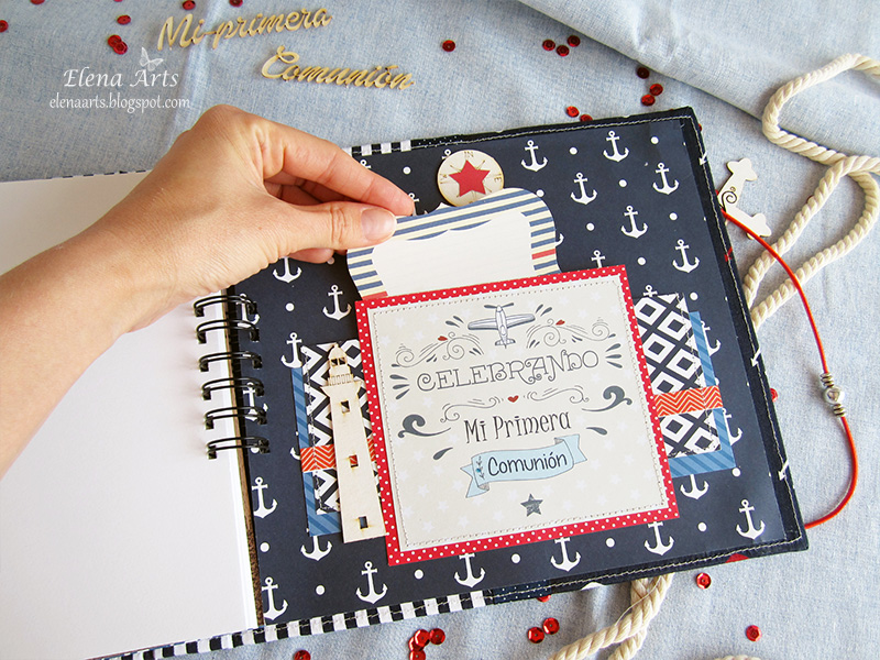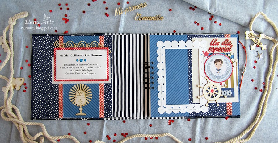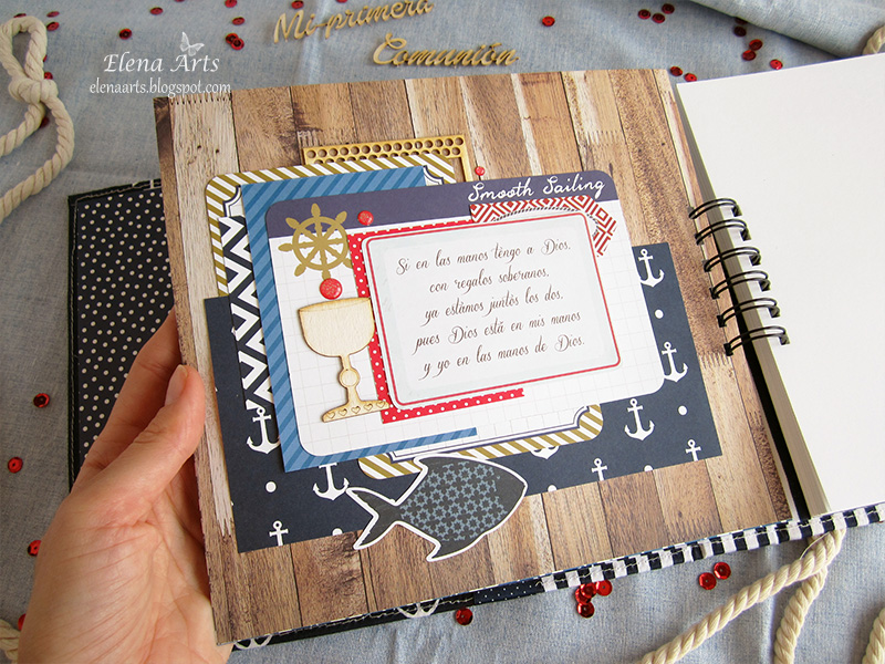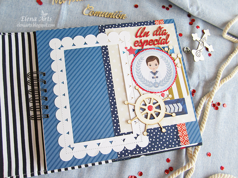 Estas son las vistas de la contraportada y la primera página con foto. Los adornos de madera son la copa, el timón, el borde las olas, una ramita de serbal y el texto "un día especial" está embosado con polvos de color rojo brillante.