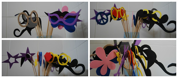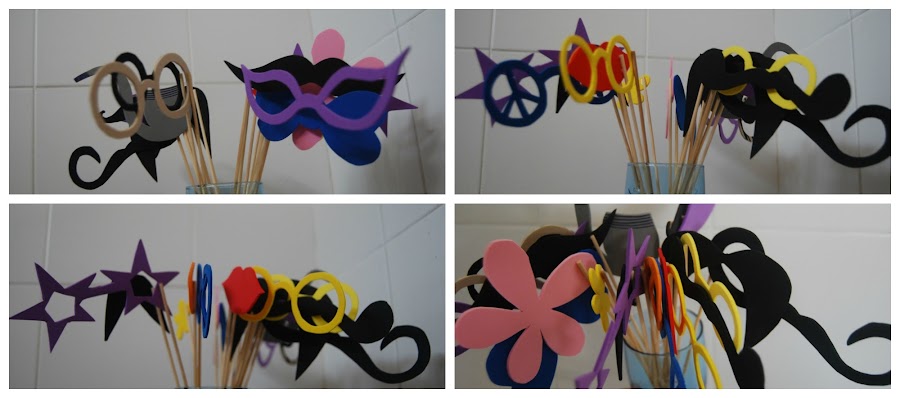 El primero y más sencillo consiste en recortar todo tipo de gafas, bigotes y todo lo que se te ocurra en goma eva o cartulina, pegarlo en un palo de brocheta y ¡a hacerse fotos!