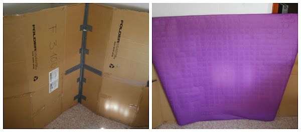 Primero hemos de conseguir un cartón muy grande o juntar varios y forrarlos con el papel que queráis y cola de carpintero y/o celo. Nosotras utilizamos manteles de papel que podéis encontrar en cualquier sitio y de cualquier color.